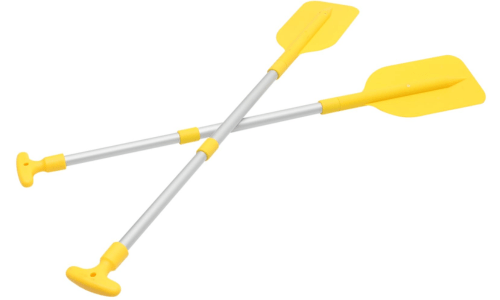 The raft paddle is made of aluminum handle and plastic blade. This paddle can be used for river rafting and for rowing a rescue boat. It is made in India.